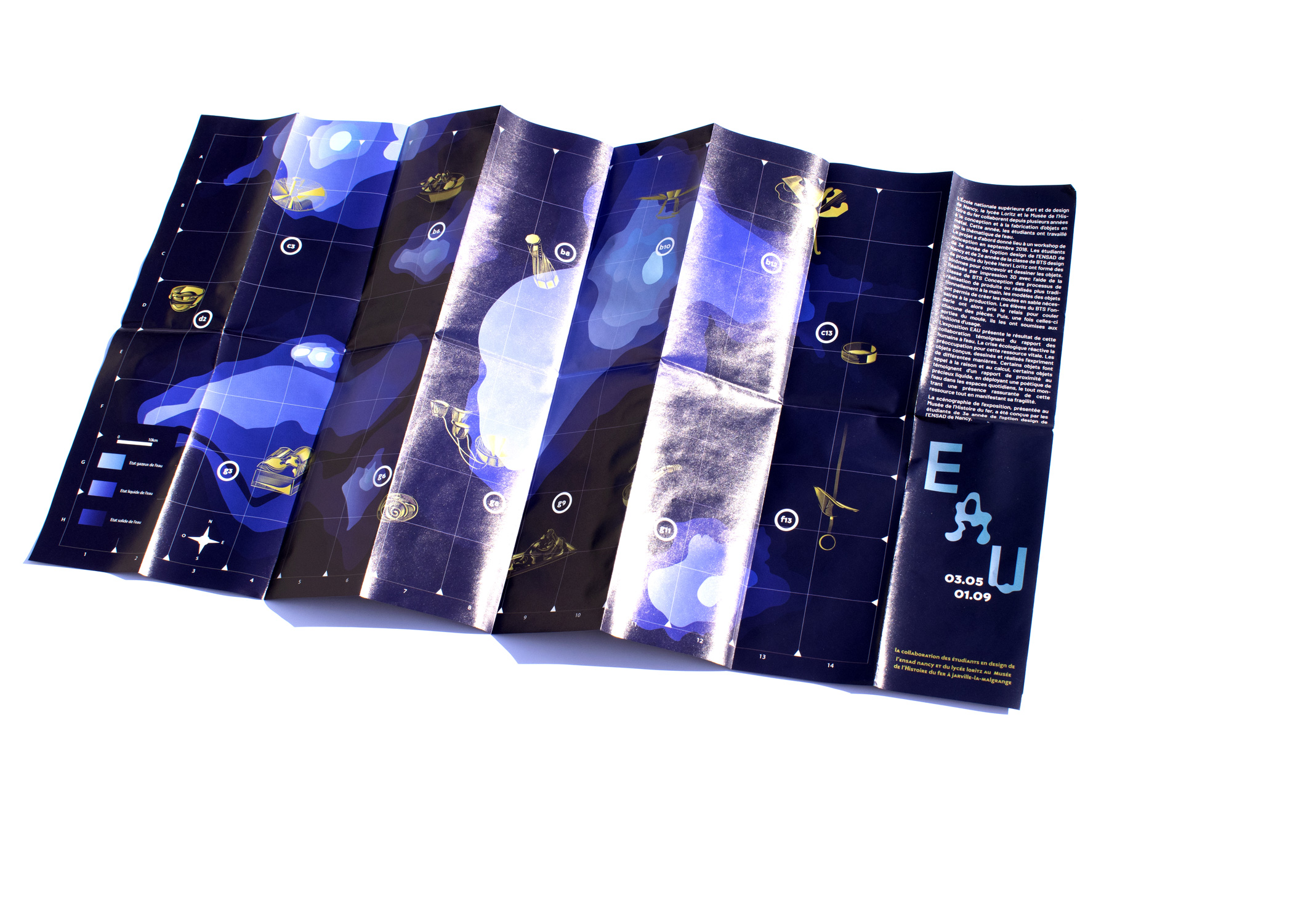 Le musée du fer a présenté l’ exposition EAU. Cette exposition témoignait du rapport des hommes à l’eau. La crise écologique réactive la préoccupation pour cette ressource vitale. Les objets conçus, dessinés et réalisés pour cette exposition l’expriment de différentes manières. À cette occasion, la charte graphique et l’identité visuelle ont été pensées selon un scénario qui raconte l’histoire d’un explorateur. Il voyage sur les quatre coins du globe. Il tient un carnet de voyage et collecte chacun des objets en bronze, nécessitant de l’eau pour leur usage.