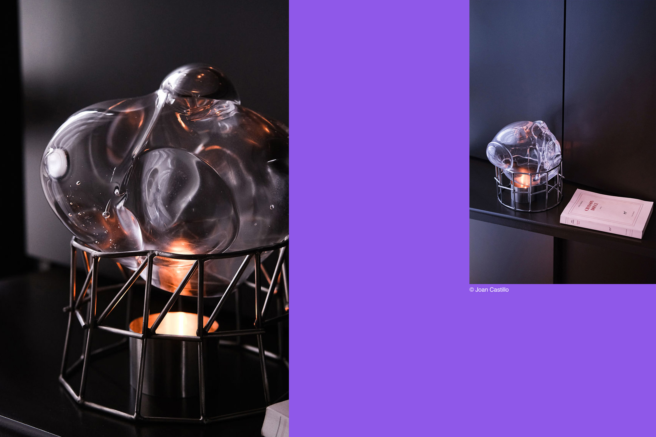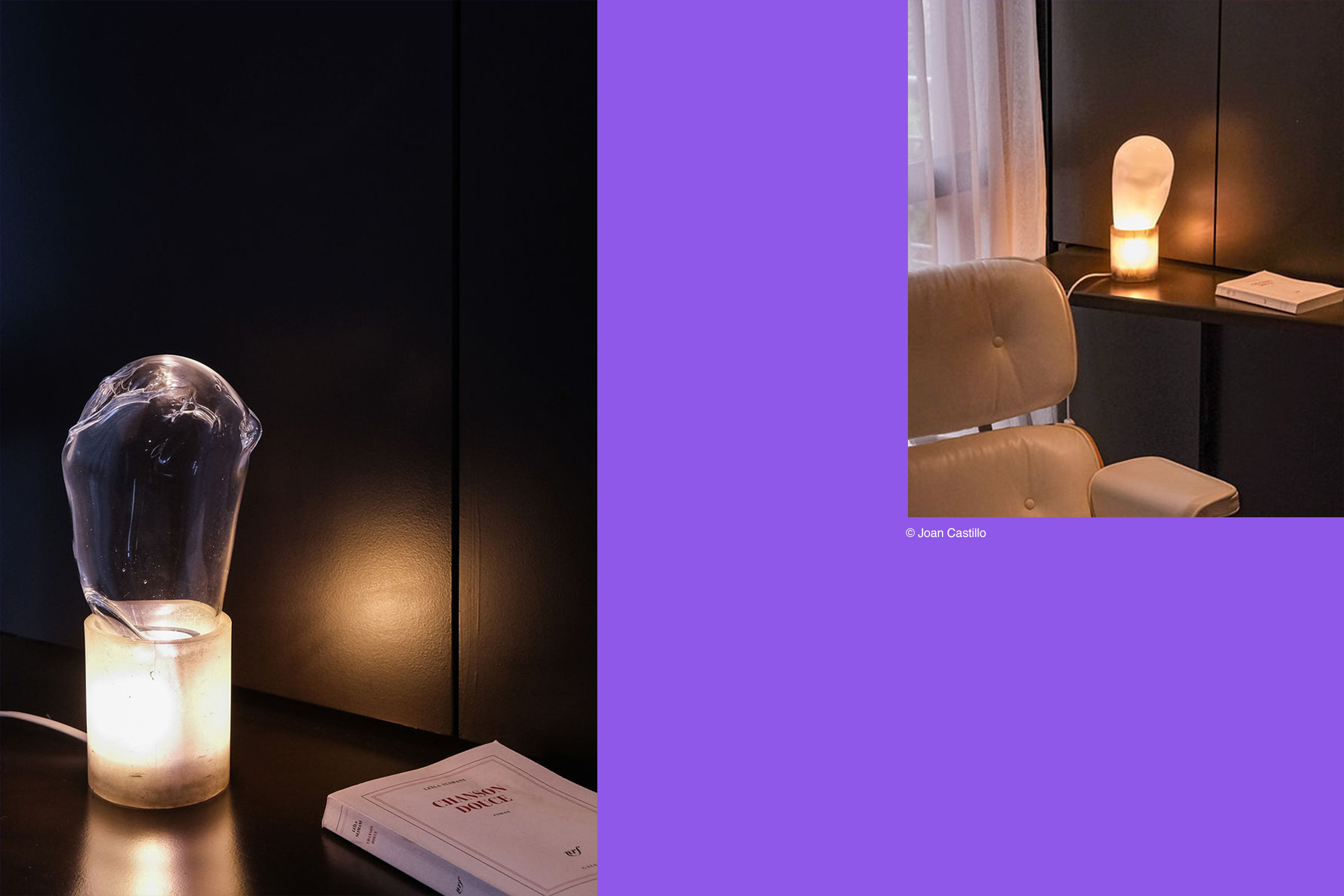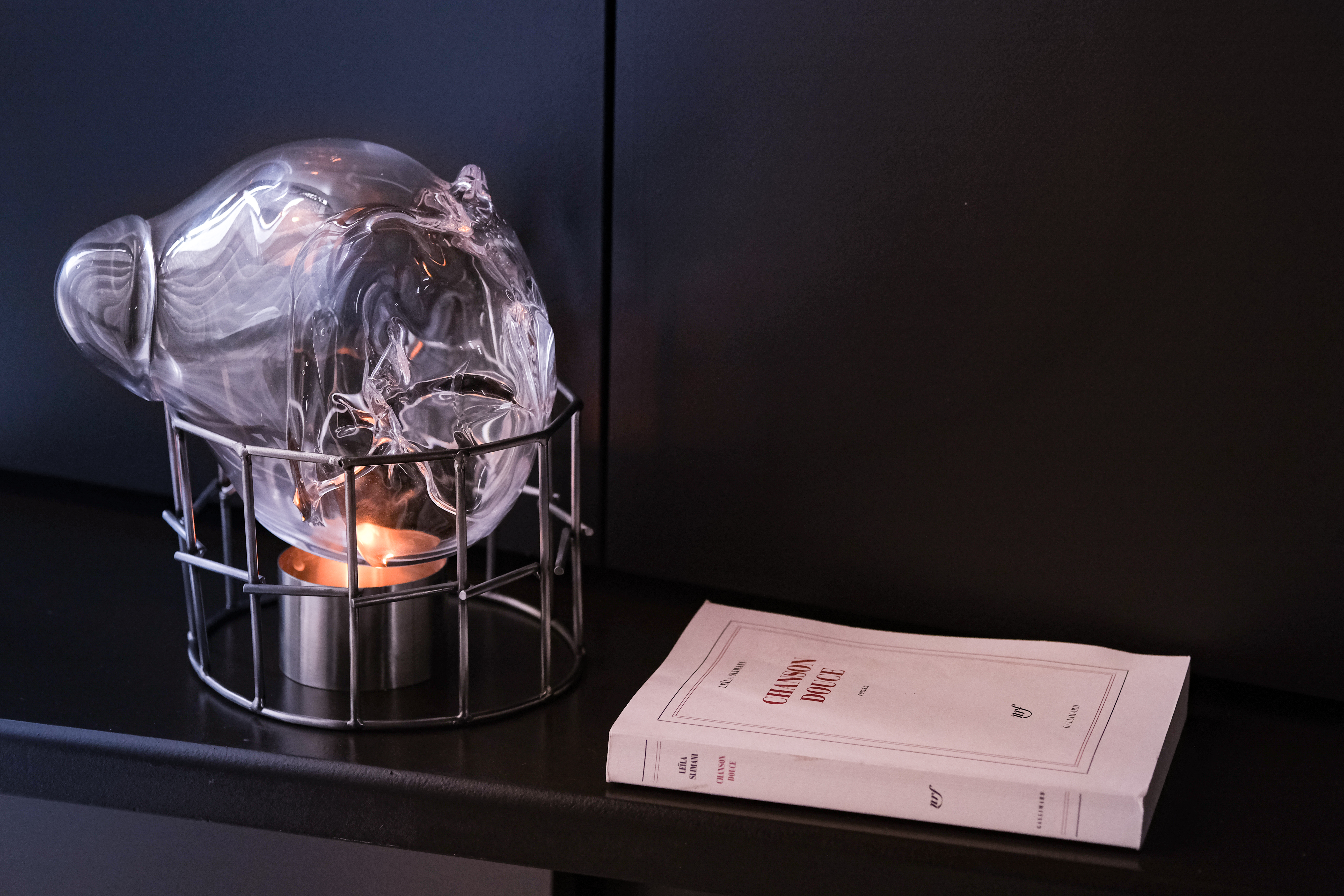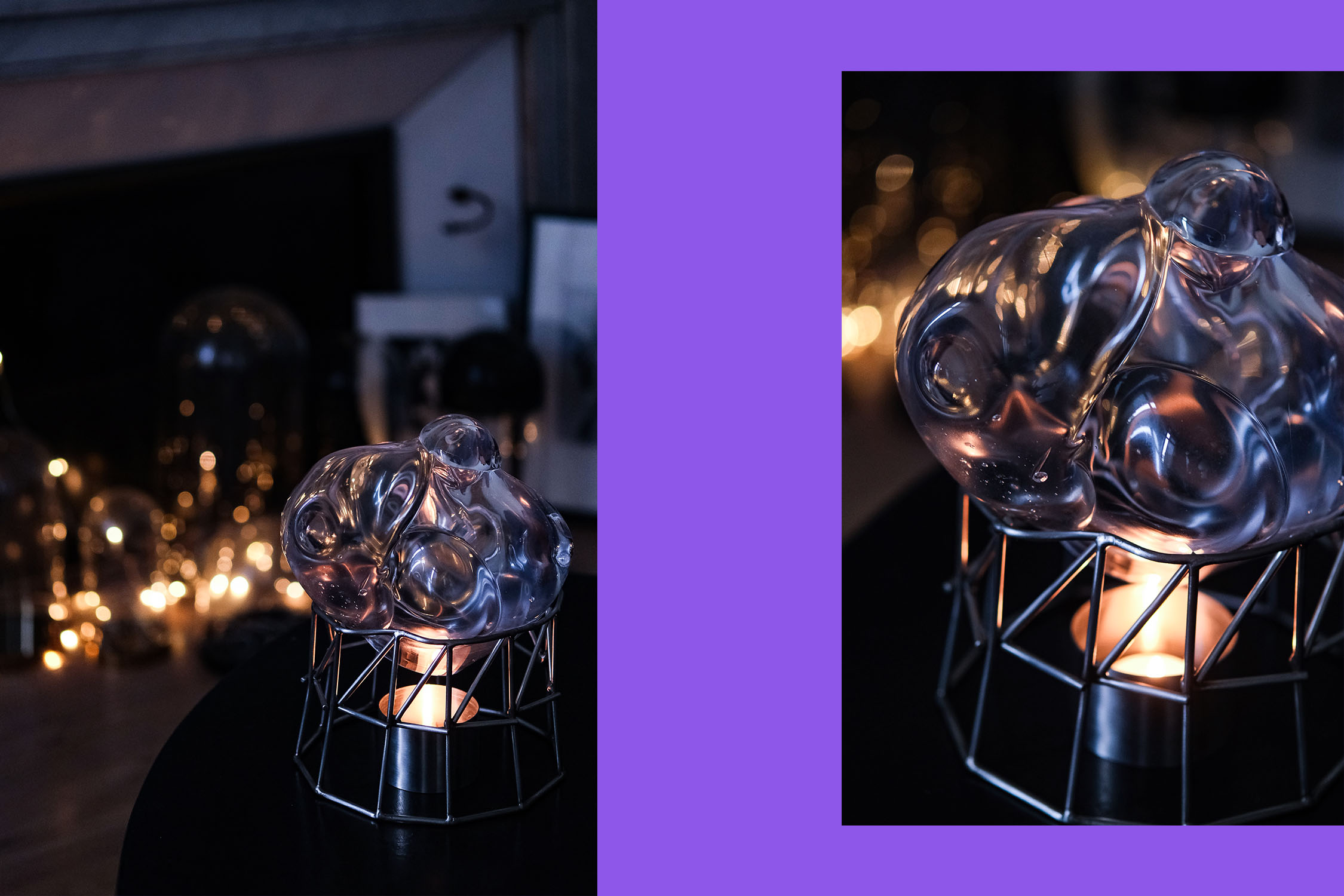 En-Bullés est l’expression et le reflet de cette période étrange de confinement. Chaque bulle est unique, singulière et indépendante comme tout être humain, individus à part entière et différents des uns des autres en société. La bulle et le verre sont étroitement liés. Tout type d’objet en verre se fait par l’étape primordiale de préparation à l’objet, la formation d’une bulle. Plus la matière du verre se gonfle, plus elle s’affine et devient extrêmement fine. Elle finit par s’éclater, tomber en morceaux, puis en particule de verre volant si le processus n’est pas arrêté à temps. Cette matière fragile doit être maniée avec délicatesse, avec précaution, tout comme nous, sinon il y a rupture. Certaines de ces bulles sont des luminaires.