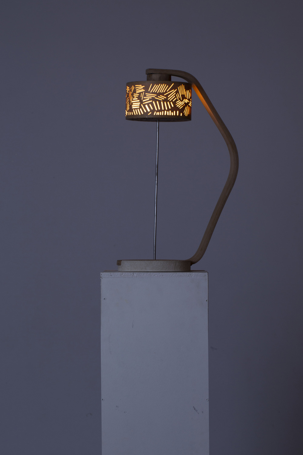 La lampe est inspirée de l’histoire du flottage en «train de bois» dans le Morvan. Dans cette région, le bois flotté voyage sur les courants d’eau, où il suit son cours, de Clamecy jusqu’à Paris. Une fois réceptionné, le bois servait à se chauffer dans les foyers parisiens de 1550 à 1850. Fluid-up’ est un luminaire mettant en scène un système, un cheminement à l’issue duquel la lumière apparaît. Les éléments graphiques perforés sur l’ abat-jour représentent les bûches de bois rassemblées pour constituer les radeaux qui traversaient le cours d’eau jusqu’à Paris.