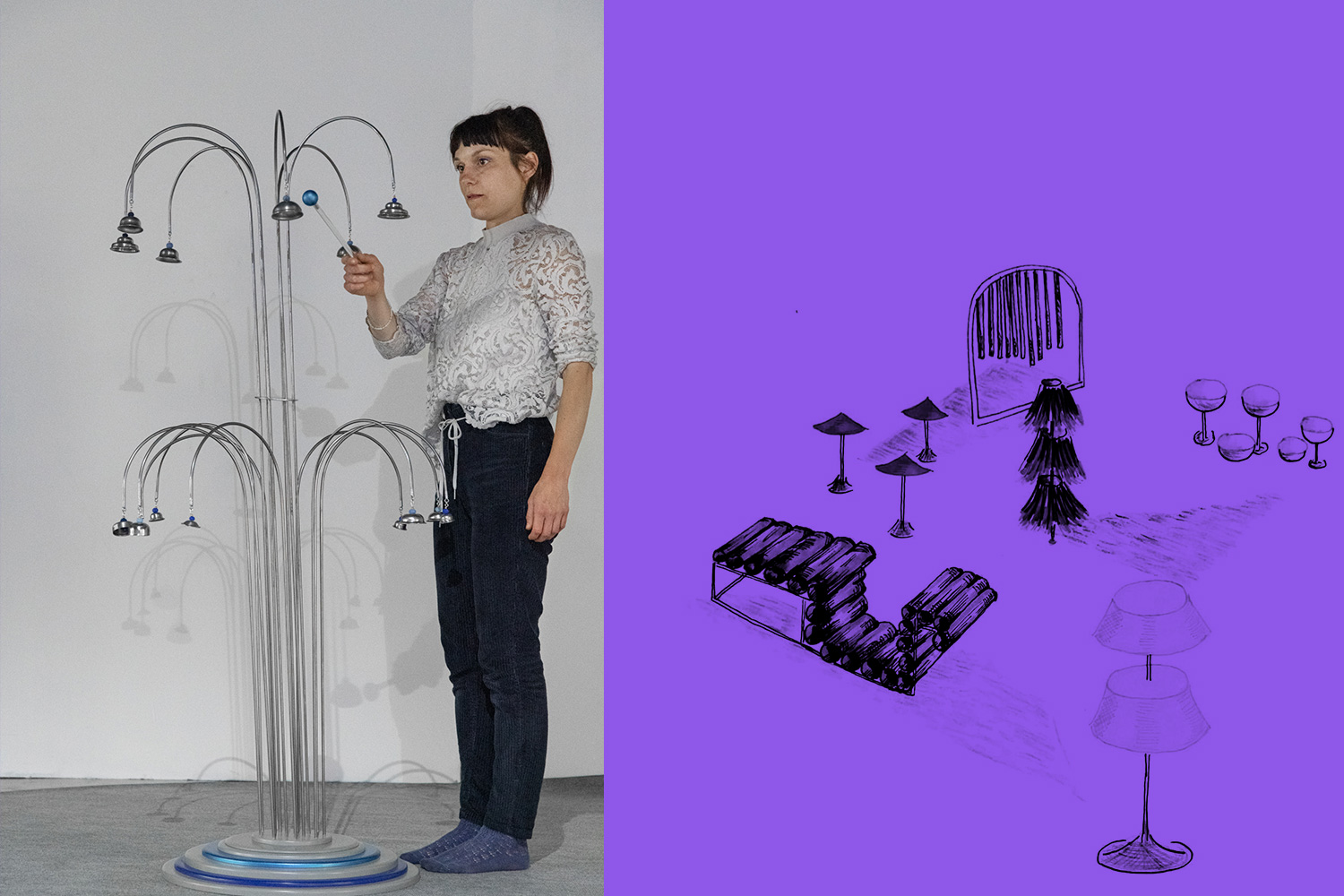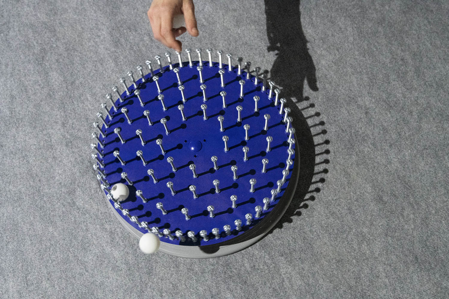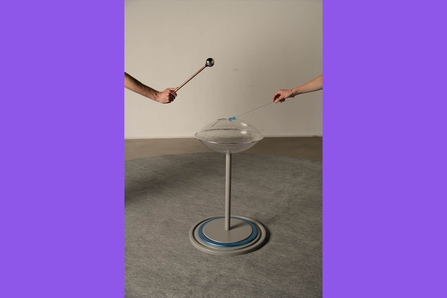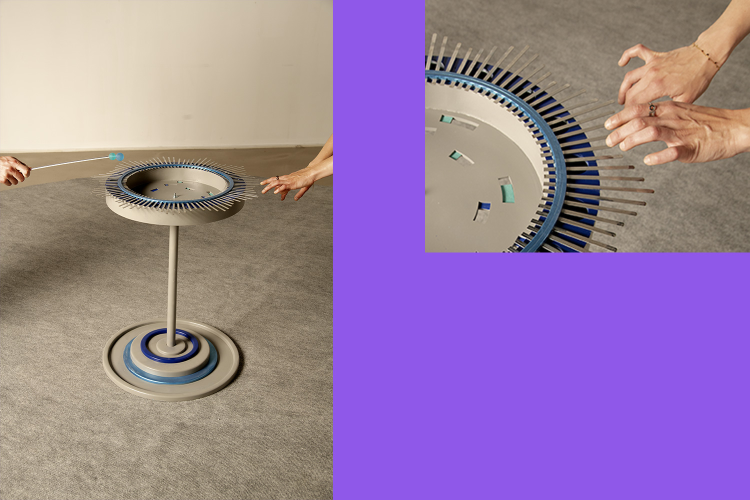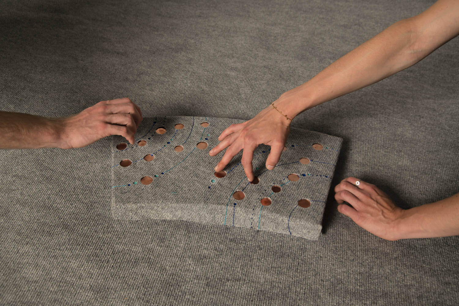 Vers un dialogue se compose premièrement d’un tapis délimitant un repère, une zone de confort, représente l’état, l’endroit symbolique où l’on peut accueillir l’ordinaire, la différence, la concentration et l’évasion. Dans un deuxième temps, différents dispositifs sonores sont positionnés sur ce cercle, les fixes surmontés d’un socle (Tamböa, Kalimba, flûte de pan, arbre à clochette) et les immuables placer au sol (boitier sonore, manège à boule). Chacun de ces dispositifs sonores a été sélectionné et conçu en fonction de leurs vertus (bien-être, réconfort, amélioration de la communication, accroitre la cohésion de groupe, encourager la créativité).
